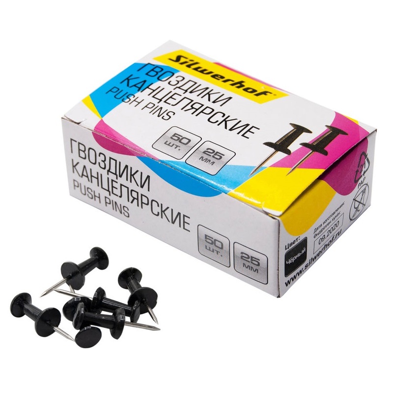Предназначены для крепления бумажных листов и небольших предметов к прокалываемым поверхностям (дерево, пробковые доски, настенные карты и др). Удобная форма пластиковой шляпки в виде пешки. Цвет: черный. В пачке 50 штук.