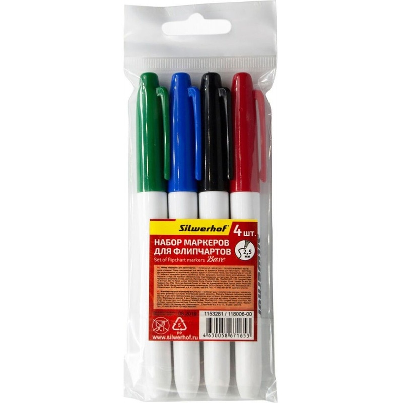 Набор маркеров для письма на флипчартах. Не пропитвывают бумагу насквозь. Наконечник пулевидный с толщиной линии 2,5мм. Не подходят для письма на магнитно-маркерных досках. Четыре цвета в пачке: черный, красный, синий, зеленый.