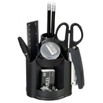 Офисный набор канцелярских принадлежностей вращающийся включает 9 самых необходимых канцелярских товаров: ножницы, 2 карандаша, шариковая ручка, степлер №10, скобы №10, линейка 15см, точилка, скрепки