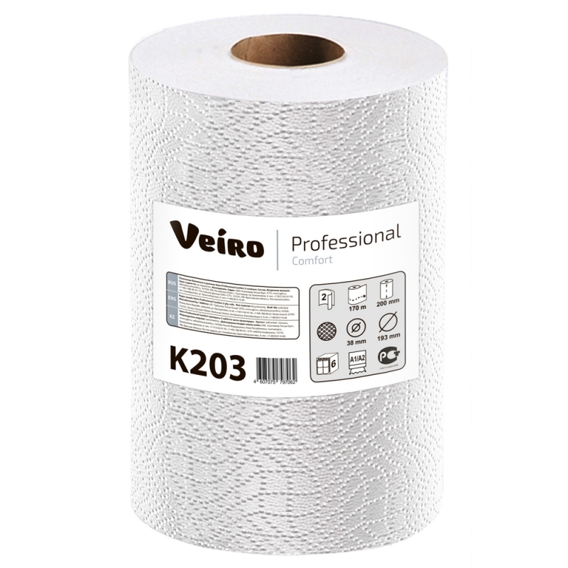 Рулонные полотенца Veiro Professional Comfort в большом рулоне (150м), двухслойные с тиснением и перфорацией из облагороженной мукулатуры (белые). Цвет: белый. В пачке 2 рулона. В упаковке 6 пачек