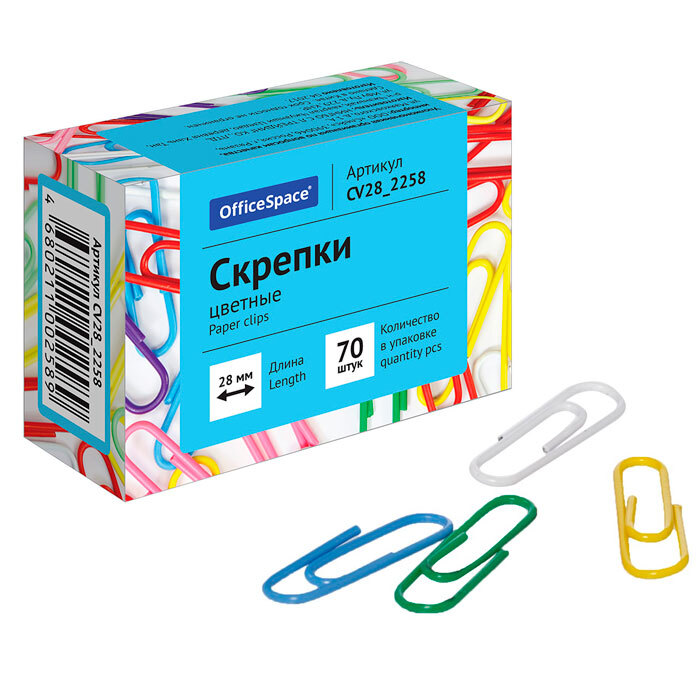 Скрепки канцелярские, цветные ассорти. Скрепки 28мм по 70шт в пачке